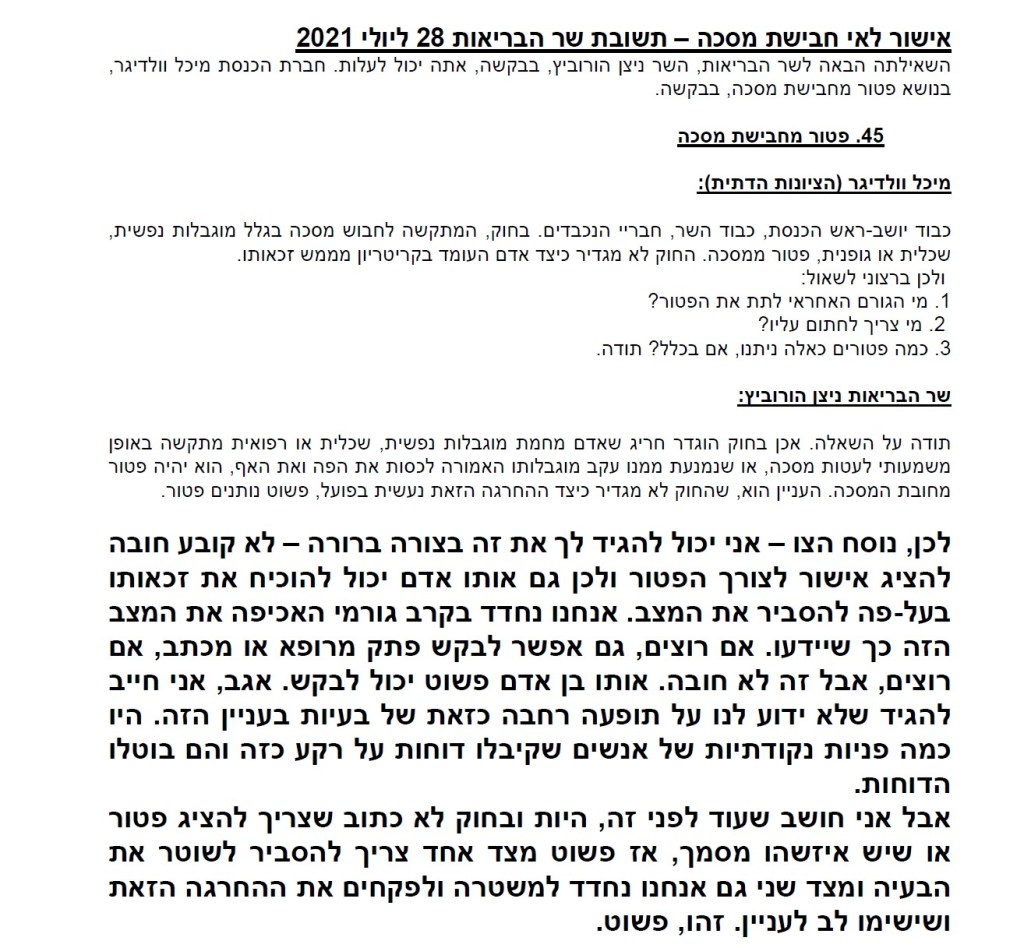 בחודש שעבר ספגתי את העלבון מהמאבטחים האלימים ואת הקושי לנשום, חבשתי לרגע מסכה ואחרי זמן קצר יצאתי החוצה, מושפל ושפוף. החלטתי לפעול כדי לקבל פטור, מסתבר שבקופת החולים הרופאים מסרבים לתת פטורים כאלה כי אף אחד לא קבע שהם צריכים ובמשרד הבריאות שולחים את מבקשי הפטור לקופות החולים. הגשתי תלונה רשמית. שלחתי אותה גם לכל חברי הכנסת. צדיקה אחת בסדום, מיכל וולדיגר הרימה את הכפפה. היא הגישה שאילתא בנושא לשר הבריאות, כן כן השמאלן אביר זכויות האזרח, שעלה על דוכן הכנסת לפני כשבועיים ואמר בצורה חד משמעית – החוק מאד ברור, אדם הפטור מחבישת מסכה לא צריך לבקש פטור מאף אחד ולא צריך להראות פטור לאף אחד. אסור בכלל לבקש ממנו. ואם שוטרים ירצו לתת לו דוח, הרי שהוא יבוטל בבית המשפט, אם אפשר לטרטר אז למה לא. אגב, לסוגיית מניעת שירות במשרדי ממשלה לא הסכים השר להתייחס למרות הפצרותיה של ח"כ וולדיגר ובמקום זה התעקש שאין צורך בפטור ואין חובה להציג כזה גם אם הוא קיים. צילמתי את פרוטוקול הישיבה והדגשתי את דבריו של השר. פרסמתי את המסמך ברשתות החברתיות והצעתי לכל אזרח לשאת את הפרוטוקול או העתק מהוידאו של הדיון בטלפון שלו כדי להראות לפקידים, לשוטרים לאוכפים. לא חשבתי שזה מאד יעזור אבל קיוויתי שכן.